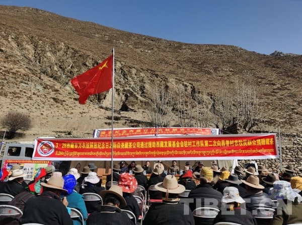 援助西藏發(fā)展基金會駐多角鄉(xiāng)昌普村工作隊(duì)與雅安相關(guān)藏茶公司向昌木普村每位村民獻(xiàn)上哈達(dá)并捐贈60份優(yōu)質(zhì)藏茶,表達(dá)對全體村民深情祝福。