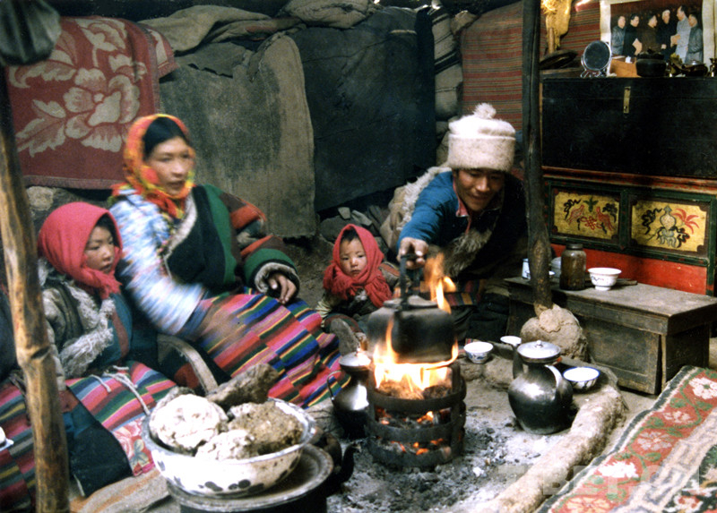 這是藏北尼瑪縣卓瓦鄉(xiāng)一戶牧民人家,在帳篷里圍著牛糞火爐燒茶取暖,其樂融融(唐召明1989年冬攝)
