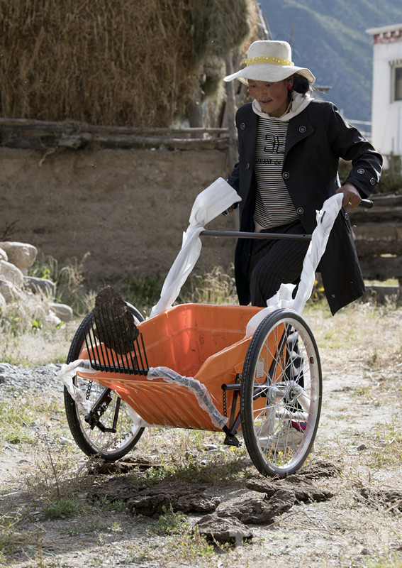 這是西藏昌都市邊壩縣邊壩鎮(zhèn)一位藏族婦女,正在使用北京建藏援藏工作者協(xié)會所捐贈的高原撿拾車撿拾牛糞(唐召明2020年8月19日攝)
