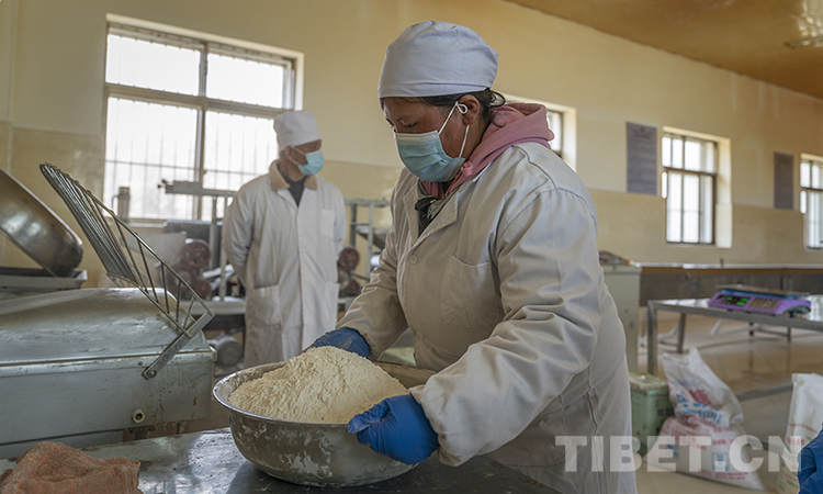 產品加工車間內,格桑南珠正在和高薪聘請的老師陳周祥一起加工糌粑餅干。“我在這里工作快一年了,在老師的帶領下基本上能獨立完成糌粑餅干的加工生產了。這里工作一天有170元錢,比在家務農的收入高多了?!?0歲的格桑南珠笑著說。