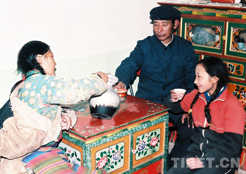 這是公覺(jué)扎朗與妻子央金和上小學(xué)的女兒玉珍在文部辦事處(現(xiàn)改為尼瑪縣)家中喝酥油茶,其樂(lè)融融(唐召明1989年攝)