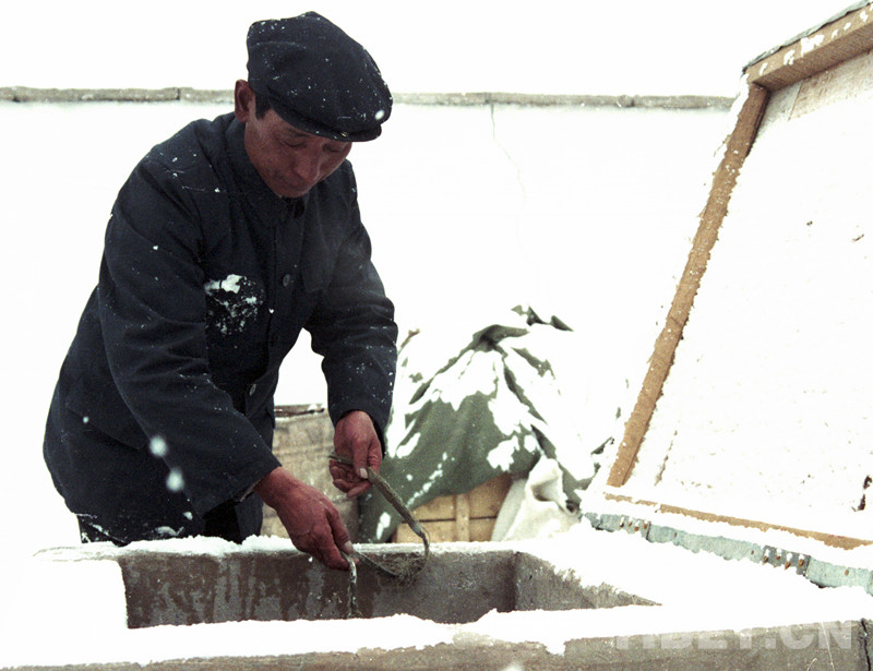 這是公覺(jué)扎朗在文部辦事處(現(xiàn)改為尼瑪縣)住地冒雪給家里打井水(唐召明1989年攝)