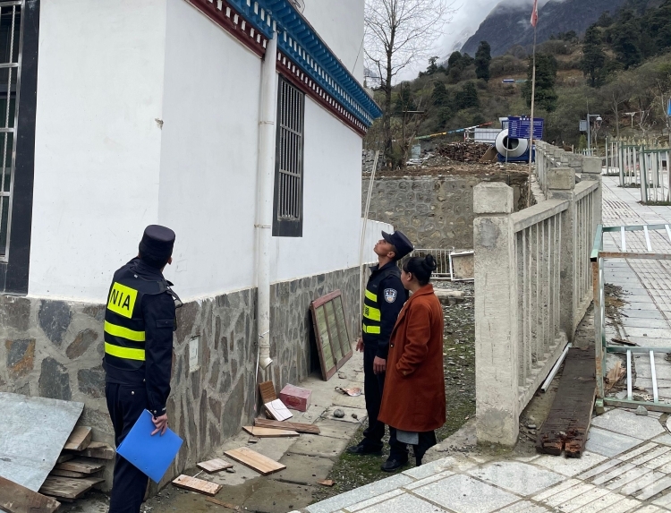 圖為西藏山南邊境管理支隊(duì)浪坡邊境派出所民警對(duì)邊民群眾住宅進(jìn)行震后排查