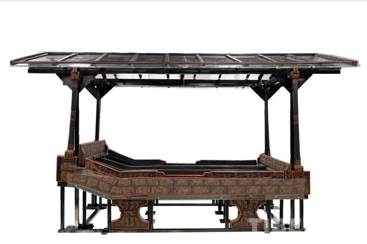 2000年,在成都商業(yè)街船棺墓葬群出土了迄今為止體量最大的船棺以及數(shù)百件精美的漆器,為古蜀文明研究提供了極其重要的實物資料。其中這件斷代約為春秋晚期到戰(zhàn)國早期、據(jù)專家推測可能來自古蜀王國的“豪華”漆床令人嘆為觀止。漆床長2.55米、高約1.8米、寬1.3米,由45個構件組合而成,構件中最長的床頂正脊長達3.27米,最小的只有26.5厘米,床頂應該還搭有織物床幔。是中國目前年代最早、體量最大、結構最為復雜、保存最完整的漆床。漆床四側床板通體黑漆,板上朱、赭二色繪制的回首狀龍紋,朱色單線勾勒的蟠螭紋華貴精美,彰顯著墓主人的尊貴身份。出土時,漆床部分構件被盜擾,飽水糟朽,結構脆弱。經(jīng)過清洗消毒、加固脫水、干燥定形等技術處理,它極致奢華的風采得以面世。