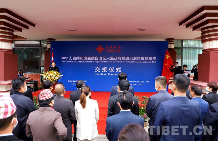 圖為5月20日舉行的中華人民共和國西藏自治區(qū)人民政府向尼泊爾政府緊急援助抗擊新冠肺炎疫情物資交接儀式 攝影:賈華加