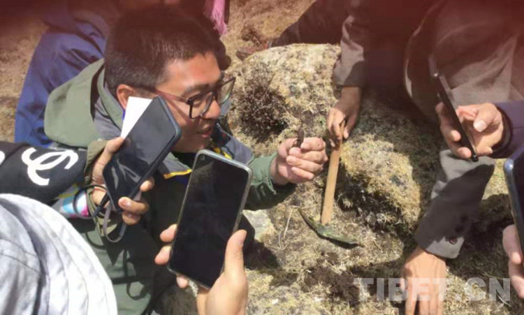 圖為周圍游客在拍挖到的蟲(chóng)草 攝影;拉姆