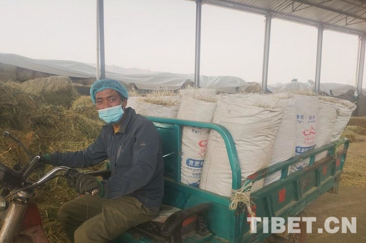 圖為崗尖村村民普布在養(yǎng)殖場運送草料 圖片由受訪者提供