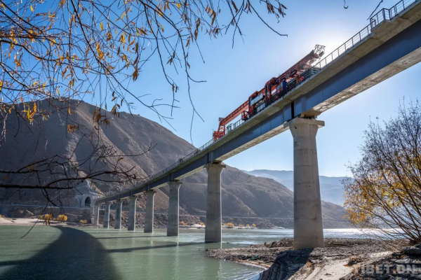 圖為2019年12月正在絨鄉(xiāng)雅魯藏布江特大橋上鋪軌的架橋機(jī)