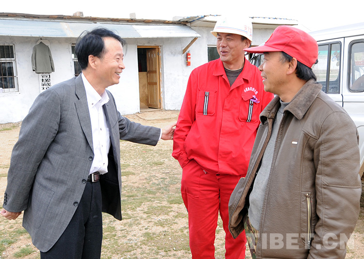 這是李一超(左)從北京來到班戈縣看望中國石化援建工程的施工人員(唐召明2009年8月11日攝)