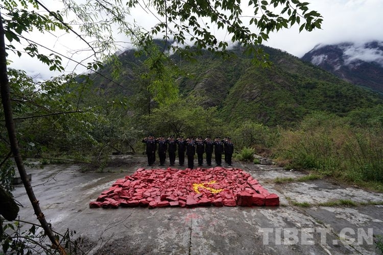圖為聶拉木邊檢站民警搬運(yùn)石頭堆砌黨旗 攝影:鄒興國