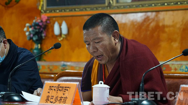 圖為扎寺管委會(huì)副主任賽巴·多布瓊發(fā)言 攝影:楊眉笑