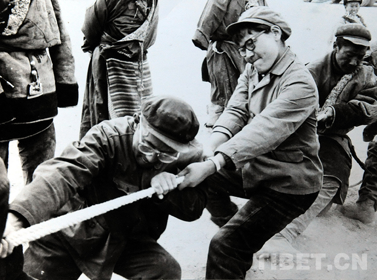 1976年盛夏,雙湖辦事處(現(xiàn)雙湖縣)副書記次仁玉珍(中)在進行拔河比賽。這是西藏開發(fā)藏北無人區(qū)后,雙湖辦事處為拓荒者首次舉辦的體育活動(唐召明翻拍資料圖片)