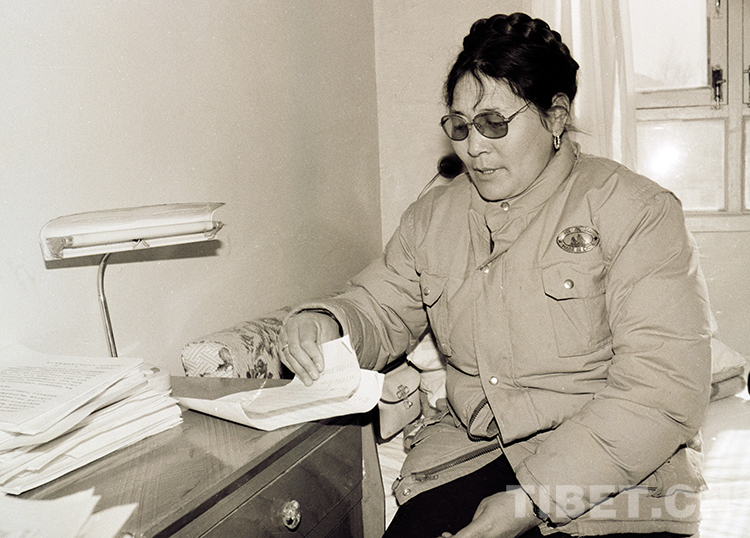 1987年,時任那曲地區(qū)(現(xiàn)那曲市)行署副專員的次仁玉珍在拉薩參加西藏“兩會”時,在駐地房間準備上會提案(唐召明1987年攝)
