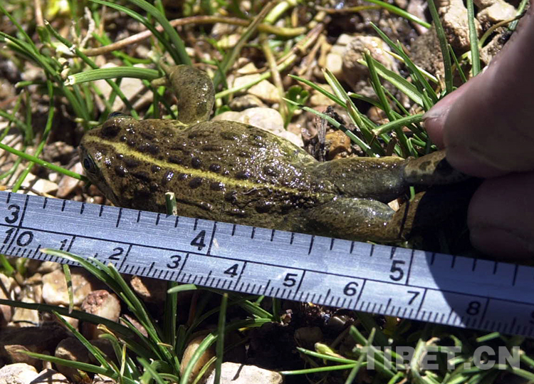 這是藏北無人區(qū)科考團(tuán)科考人員在給申扎縣雄梅鄉(xiāng)所發(fā)現(xiàn)的高山蛙量體長(zhǎng)。這種高山蛙的新發(fā)現(xiàn),填補(bǔ)了我國(guó)高海拔地區(qū)沒有蛙類生存的空白(唐召明2001年攝)