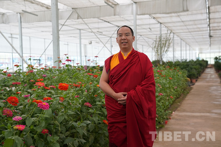 圖為班禪在溫室大棚鮮花前留影 攝影:王淑