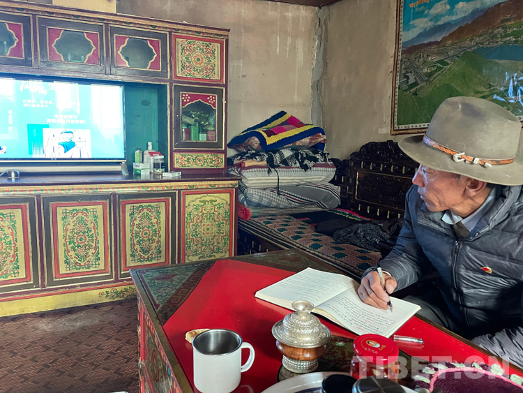 圖為索朗頓珠收聽收看時(shí)政新聞