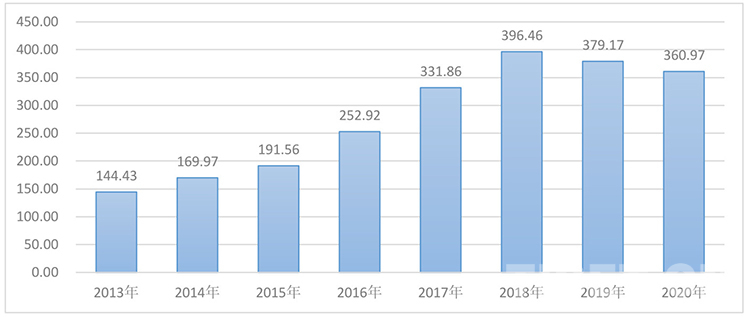 圖為 2013—2020年西藏稅收收入規(guī)模(億元)