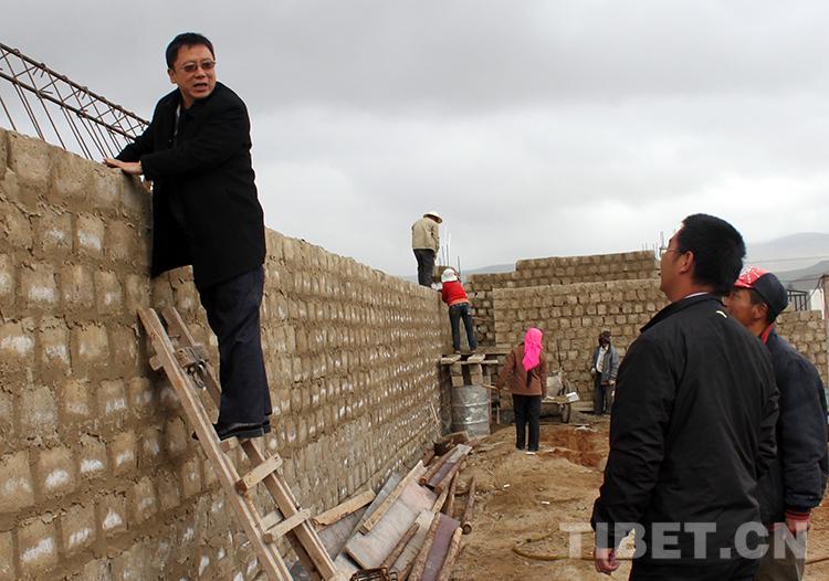 圖為中國(guó)石化第五批援藏干部、班戈縣常務(wù)副縣長(zhǎng)潘峰(左)和副書記陳志清(右)在班戈縣鄉(xiāng)下檢查牧民定居房的施工情況(唐召明2011年6月25日攝)