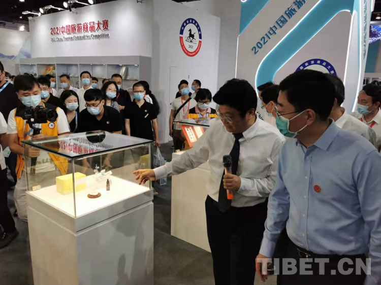 圖為國家文化和旅游部副部長杜江(右)聽取中國旅游協(xié)會(huì)旅游商品與裝備分會(huì)秘書長陳斌(左)介紹獲2021中國旅游商品大賽銀獎(jiǎng)的“西藏禮物”文創(chuàng)產(chǎn)品“瑪尼石香氛”。