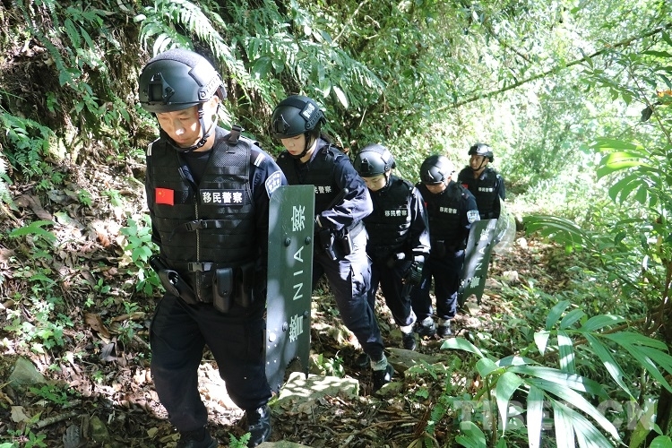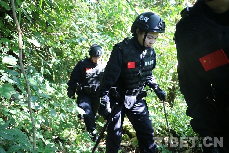 走在隊伍最前面的是經(jīng)驗豐富的老民警李永杰,他手里拿著一把砍刀,一邊清理小路兩側(cè)蔓延出來的枝椏,一邊時刻注意著兩位女民警情況。隨著海拔升高,走進樹木茂盛的叢林,陽光只能從郁郁蔥蔥的樹葉間撒下兩三縷光芒,兩名女民警瞪大眼睛好奇地觀察著周圍,對接下來的行程充滿期待。
