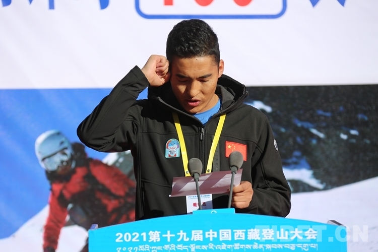 圖為國家體育總局登山運動管理中心副主任、中國登山協(xié)會副主席、中國登山隊隊長王勇峰為2021第十九屆中國西藏登山大會授旗 攝影:賈華加