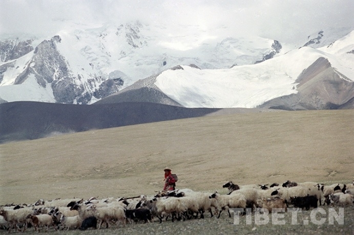 這是一位牧女在藏北雪山下放牧羊群(唐召明1996年攝)