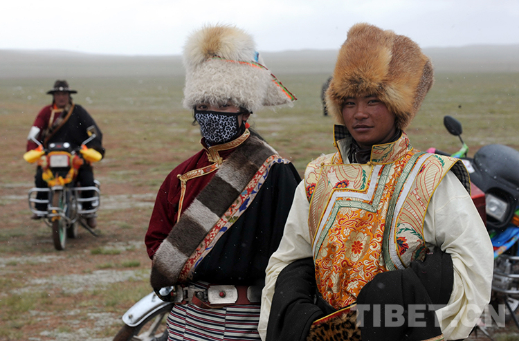 這是兩位青年牧民著盛裝參加雙湖縣的“撤區(qū)建縣”慶?;顒樱ㄌ普倜?013年7月26日攝)