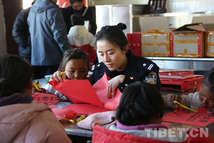 圖為拉薩邊檢站民警和孩子們共同完成手工剪紙 攝影:王佳豪