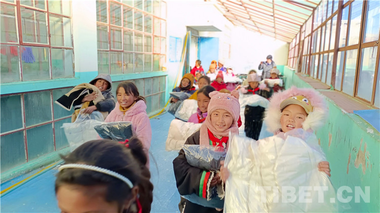 圖為向古姆鄉(xiāng)小學(xué)捐贈(zèng)羽絨服