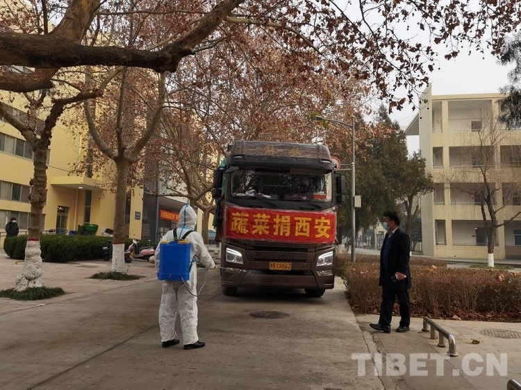這是由河南南陽社區(qū)志愿者協(xié)會組織的馳援陜西的大卡車,兩位志愿者協(xié)會成員于2022年1月4日晚11時30分出發(fā),驅(qū)車千里一夜未眠,只為第一時間把新鮮蔬菜送到學校,助力抗疫。1月5日上午11時,在西藏民族大學第一餐廳廣場前,舉行了捐贈儀式。