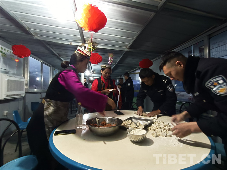 “阿久(藏語音譯:大叔),包餃子得講究手法,你要把餡放皮中央?!泵窬悋七呏v解邊演示,一個(gè)個(gè)餃子范本整整齊齊擺在托盤上。香腸、臘肉、餃子、羊肉、雞湯、糌粑、火鍋.....一桌藏漢式的年夜飯準(zhǔn)備完畢,大家圍坐在圓桌旁,舉杯共祝新春,濃濃的年味兒在夏爾巴第一村溢出,教導(dǎo)員康林感嘆道:“雖然春節(jié)不能回家,但是我們就是一個(gè)大家,祝大家新年快樂,扎西德勒!”