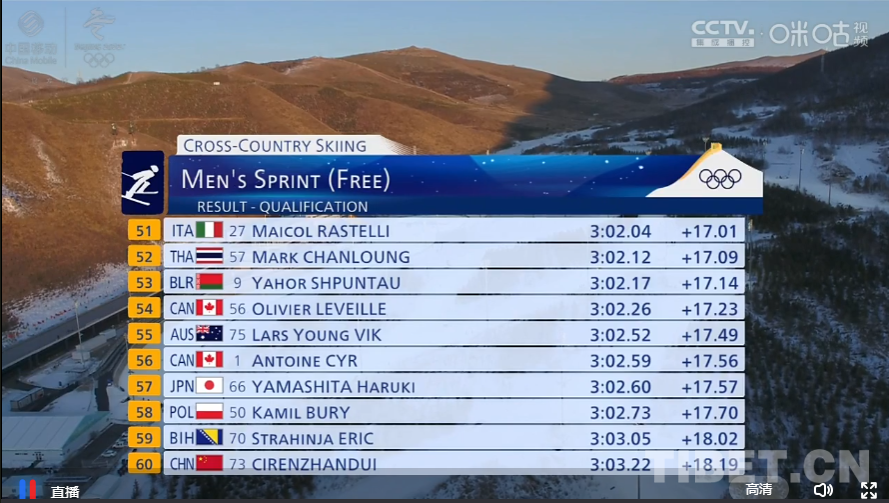 圖為北京冬奧會越野滑雪個人短距離(自由技術(shù))資格賽成績