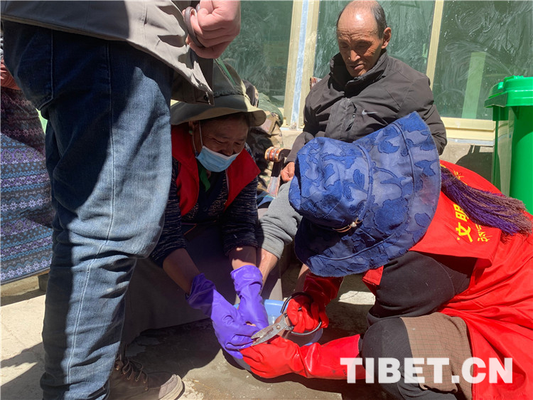 圖為黨員們幫助不能自理的羅布次仁修剪腳趾甲