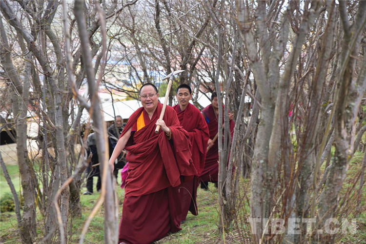 圖為達扎委員帶領(lǐng)達扎寺僧人和當?shù)厝罕娭矘湓炝?/p>