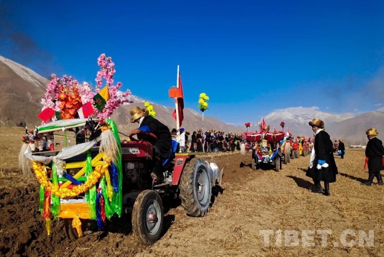 據(jù)悉,儀式當日上午,村民們會身著節(jié)日盛裝,歡聚在田間地頭、載歌載舞隆重舉行春耕春播儀式?;顒蝇F(xiàn)場,姑娘們舉起手中的切瑪、青稞酒、人參果為犁手們唱歌敬酒,在祝福的歌聲中,開啟春耕“第一犁”。在西藏,過去是牦牛耕地,如今,隨著農(nóng)業(yè)科學化發(fā)展,現(xiàn)在農(nóng)耕都用現(xiàn)代化的拖拉機“鐵?!备?。一般吉時一到,一個個犁手頭頂金黃圓筒帽,身穿氆氌藏裝駕著一輛輛插著五星紅旗,系著潔白哈達的“鐵牛”緩緩駛進田間,一片片沃土隨著鐵犁慢慢翻開,婦女們在后面播撒青稞良種……在田埂上形成一道最靚麗的風景線,好不壯觀!