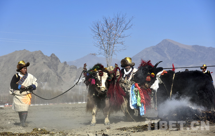 迎著初升的太陽,記者從拉薩市區(qū)出發(fā)前往雅魯藏布江北岸的山南市扎囊縣扎其鄉(xiāng)孟卡榮村春耕現(xiàn)場。寓意豐收的切瑪盒、紅色穗子裝扮的牦牛、彩色布條裝飾的耕整機……置身其中,熱鬧非凡。