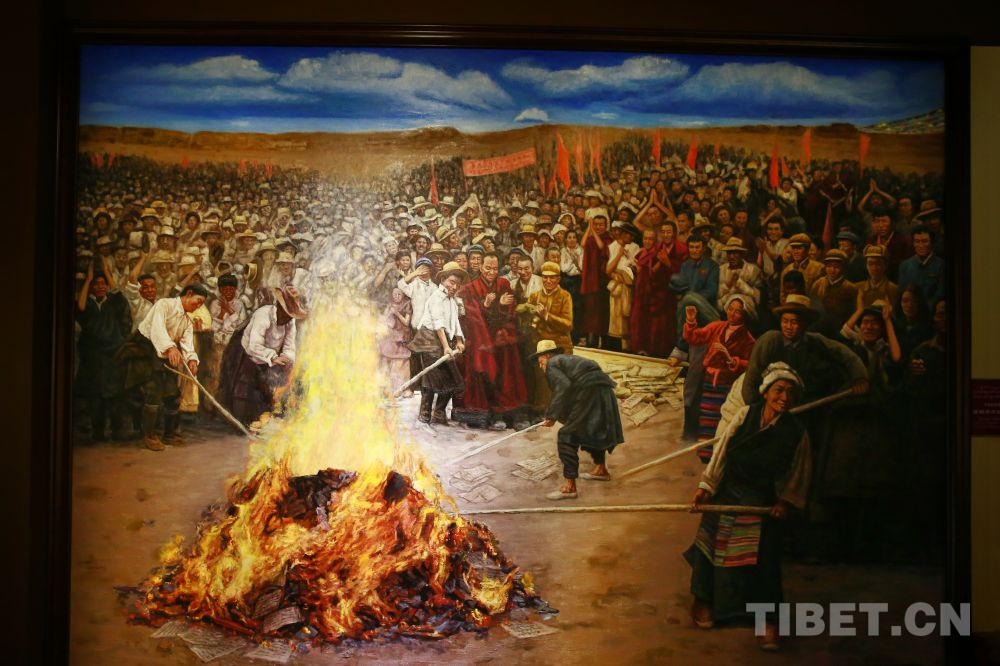1959年3月,西藏開始實施民主改革,圖為達孜縣翻身農奴正在焚燒契約和債券文書 翻拍:許娜