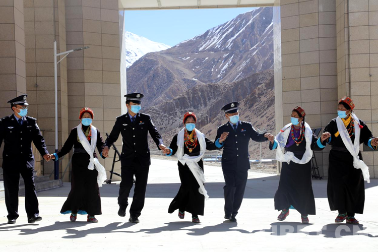活動(dòng)中,邊民群眾與移民警察在國(guó)門(mén)下興高采烈地跳起了藏族傳統(tǒng)鍋莊舞,用歌聲和舞蹈表達(dá)他們的喜悅心情,以自己的方式慶祝這一不凡的日子。