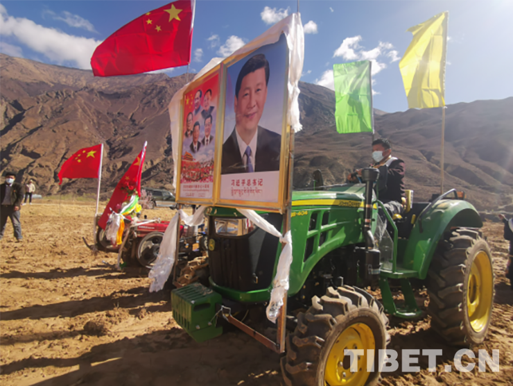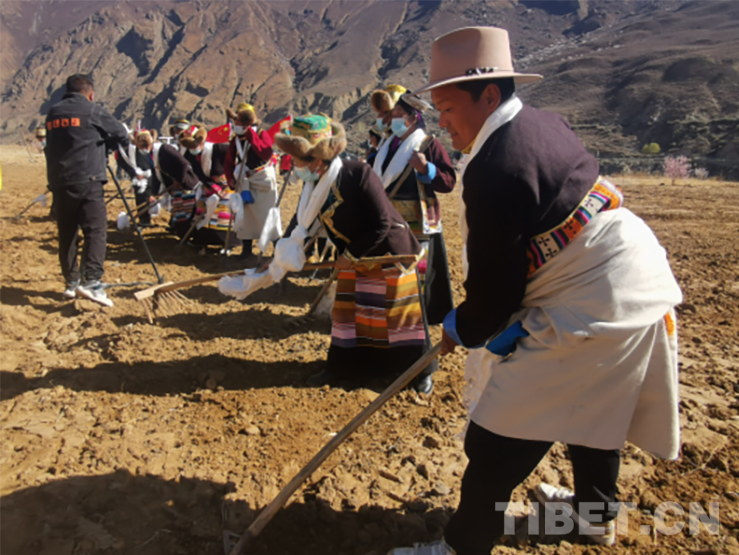 活動現(xiàn)場,群眾頭戴藏式金花帽,身著氆氌藏裝,或手持犁耙和鋤頭,或開著拖拉機(jī),以吃切瑪、敬青稞酒、獻(xiàn)哈達(dá)、跳鍋莊、犁地、播種等傳統(tǒng)習(xí)俗,隆重慶祝共康村首屆開耕節(jié)。