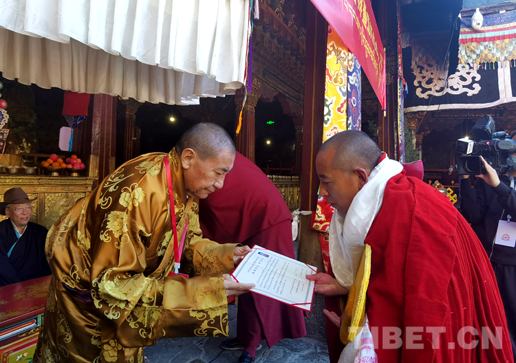 圖為中國(guó)佛教協(xié)會(huì)西藏分會(huì)常務(wù)副會(huì)長(zhǎng)珠康·土登克珠活佛(左)向考僧頒發(fā)學(xué)位證書(shū) 攝影:王淑