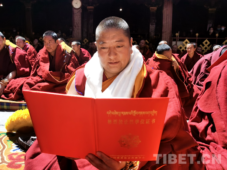 活動(dòng)現(xiàn)場(chǎng),西藏自治區(qū)人民政府副秘書(shū)長(zhǎng)馬立柱代表西藏自治區(qū)人民政府向獲得學(xué)位的考僧贈(zèng)送五彩緞、干果、袈裟和禮金;西藏自治區(qū)宗教局副局長(zhǎng)達(dá)娃窮達(dá)向參加答辯活動(dòng)的僧人發(fā)放布施;中國(guó)佛教協(xié)會(huì)西藏分會(huì)常務(wù)副會(huì)長(zhǎng)、西藏佛學(xué)院院長(zhǎng)珠康?土登克珠致賀詞,并代表班禪額爾德尼?確吉杰布會(huì)長(zhǎng)向獲得學(xué)位的考僧獻(xiàn)哈達(dá)、頒發(fā)學(xué)位證書(shū)。