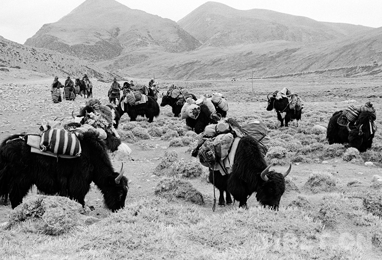 這是一支正在前往藏北無人區(qū)鹽湖馱運鹽巴的牦牛馱隊(唐召明1988年攝)