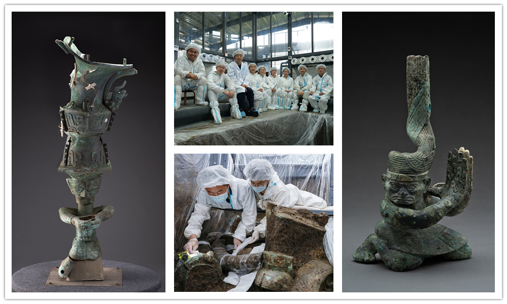 圖左為三星堆遺址三號坑出土銅頂尊跪坐人像;圖中上為部分發(fā)掘人員合影;圖中下為象牙保護與提??;圖右為三星堆遺址四號坑出土扭頭跪坐銅人像 圖片來源:國家文物局