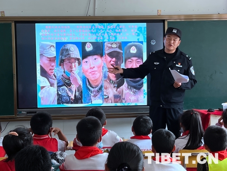 中國西藏網(wǎng)訊 “同學(xué)們,大家知道照片上這位英雄是誰嗎?”伴隨著民警周升展的提問聲,孩子們紛紛舉起手回答出了這位英雄——祁團(tuán)長?!澳銈冋媛斆鳎裉焓迨褰o大家講一講新時代衛(wèi)國戍邊英雄祁發(fā)寶團(tuán)長的故事……”
