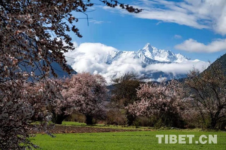 圖為雅魯藏布大峽谷景區(qū)雪山和桃花映襯