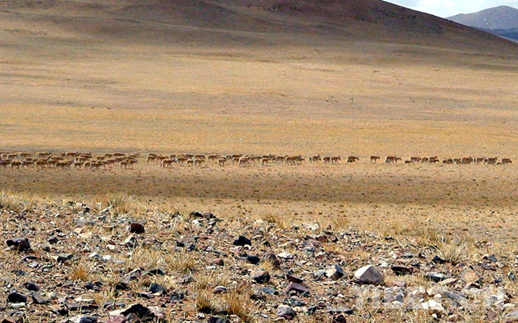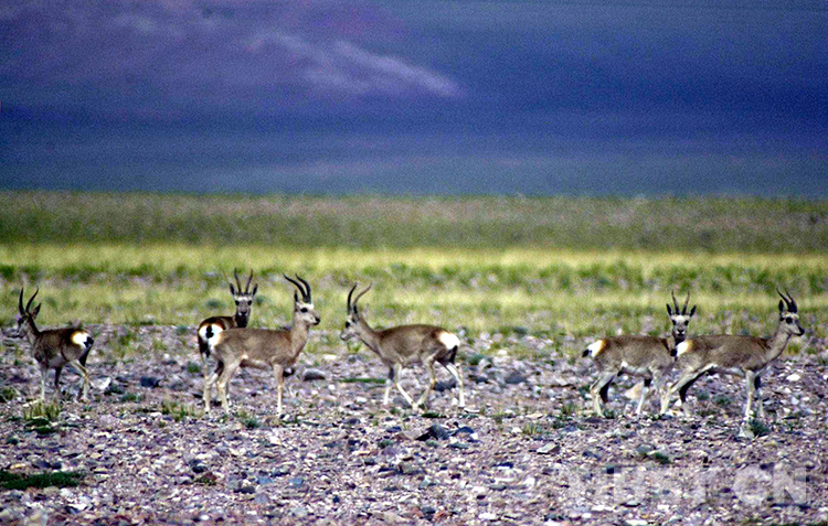 上世紀(jì)八十年代,時(shí)任那曲地區(qū)雙湖辦事處(現(xiàn)那曲市雙湖縣)書(shū)記的阿布,曾在色務(wù)崗日和瑪依崗日一帶遇到過(guò)遷徙產(chǎn)羔母羚羊。那浩浩蕩蕩的一群,約有數(shù)千只。剛遠(yuǎn)遠(yuǎn)望見(jiàn)它們的影子,那喧囂聲已充耳可聞。羚羊群前進(jìn)卷起的塵土遮天蔽日,猶如千軍萬(wàn)馬通過(guò)大草原。這是動(dòng)物王國(guó)里的盛大節(jié)日,是威武雄壯的“閱兵式”。