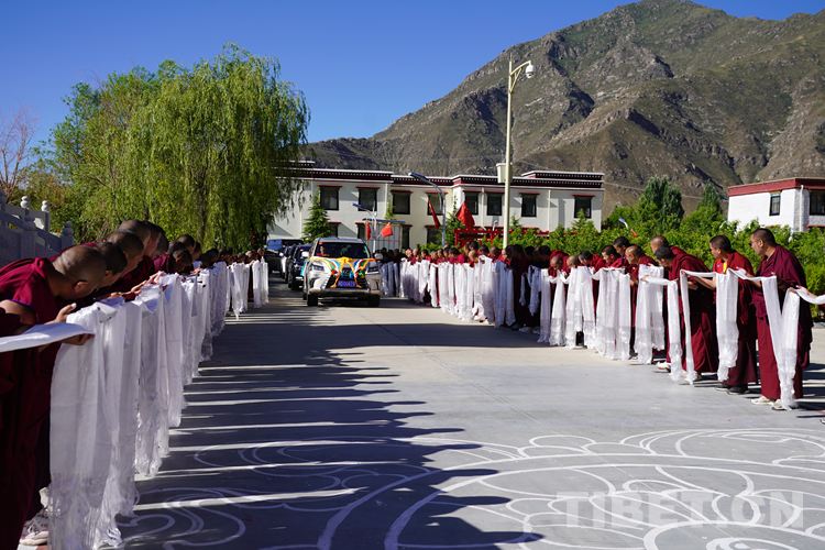圖為班禪抵達(dá)西藏佛學(xué)院并向僧眾致意 攝影:王淑