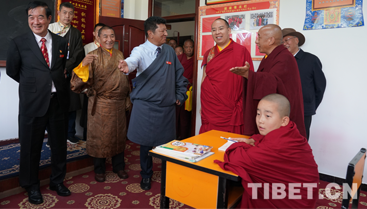 圖為班禪來(lái)到少年活佛班了解少年活佛學(xué)習(xí)、生活情況 攝影:王淑