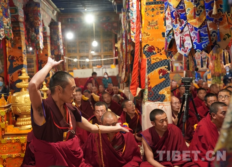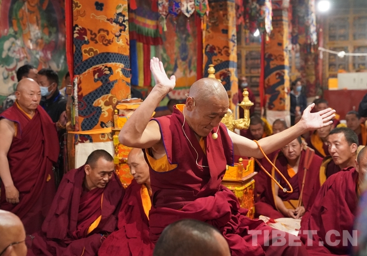 朝拜結束后,班禪步入甘丹寺夏孜扎倉,現(xiàn)場觀摩2023年度西藏自治區(qū)藏傳佛教學經(jīng)僧人晉升格西拉讓巴學位夏季預考活動。