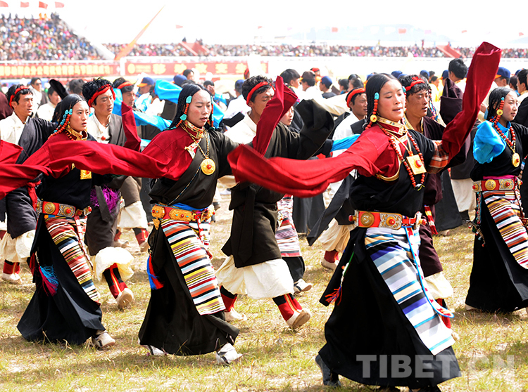 這是在藏北首府那曲鎮(zhèn)舉辦的草原賽馬盛會上,如今沒有了“高原紅”的藏族婦女在跳大型“鍋莊舞”(唐召明2013年8月10日攝)